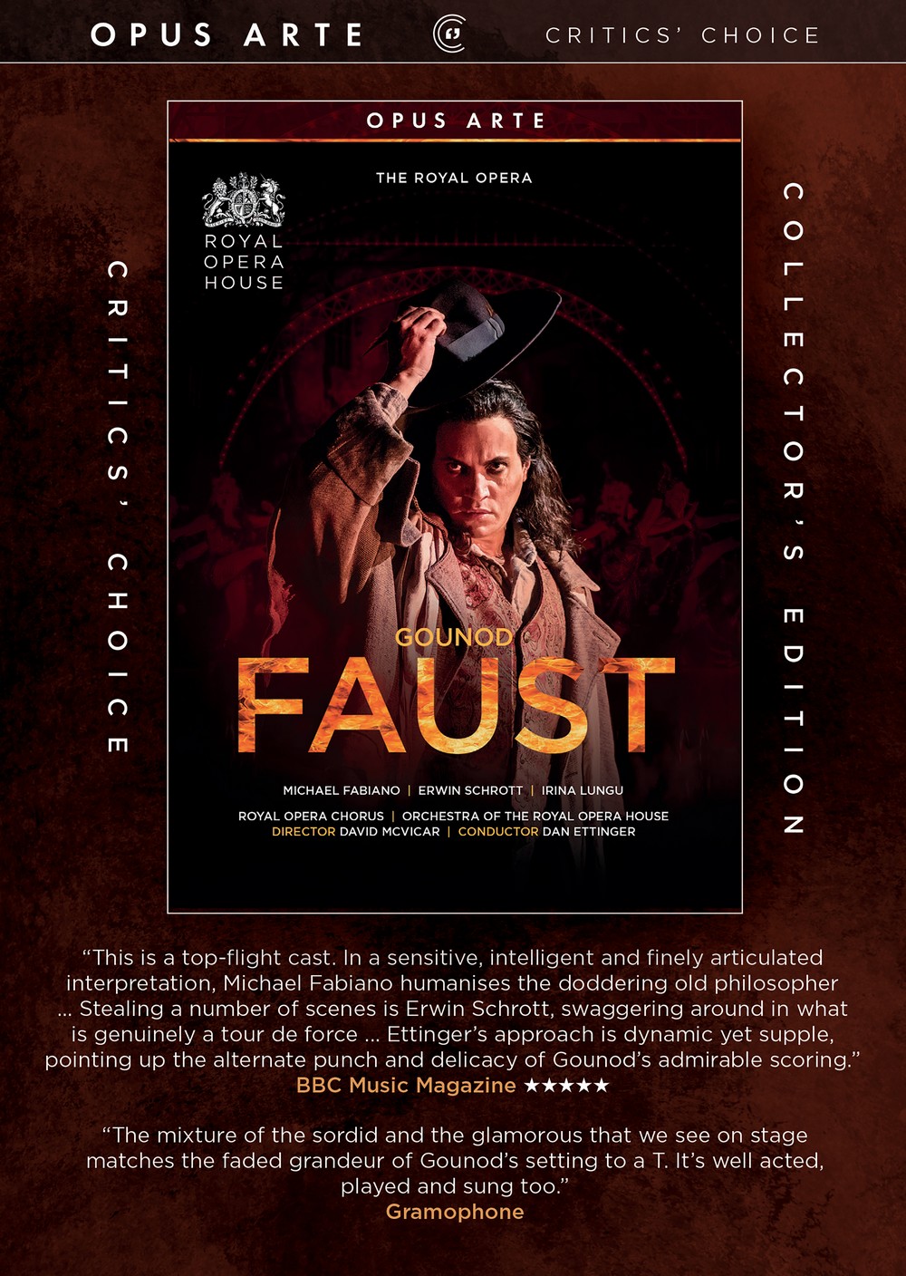 Gounod’s masterpiece is given the grandest of Royal Opera stagings in David McVicar’s richly layered and theatrically exuberant production, with the drama moved to Second Empire Paris, spectacular sets and costumes, and extensive dance. Michael Fabiano as a seductively witty Faust, Erwin Schrott as a devilish Méphistophélès and Irina Lungu as a passionate Marguerite are joined by the Royal Opera Chorus and a cast of Royal Opera favourites. Dan Ettinger conducts the Orchestra of the Royal Opera House in Gounod’s gloriously tuneful score.
